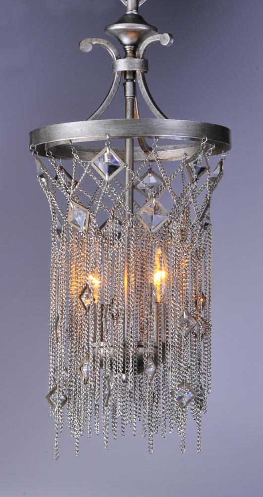 Diamond shape crystals float in a web of jewelry grade chain supported by a metal frame finished in in our exotic Silver Mist. Each fixture is delicately draped by hand from skilled artisans to create these original lighting art forms.