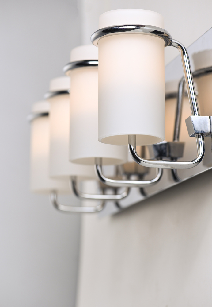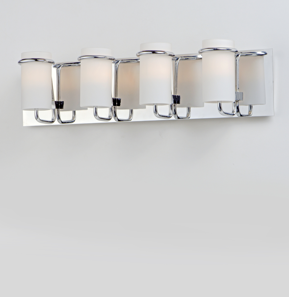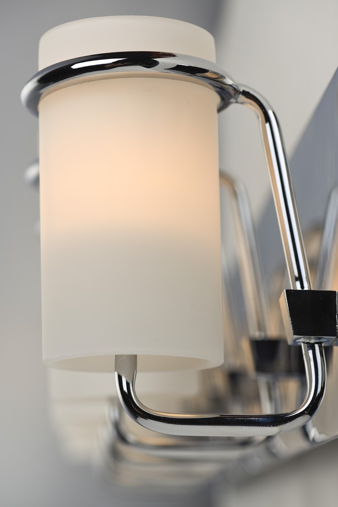 Satin White glass cylinders are cradled in castings of Polished Chrome to create this crisp and clean contemporary design. Each fixture is supplied with xenon lamps for good illumination. High style at an affordable price.