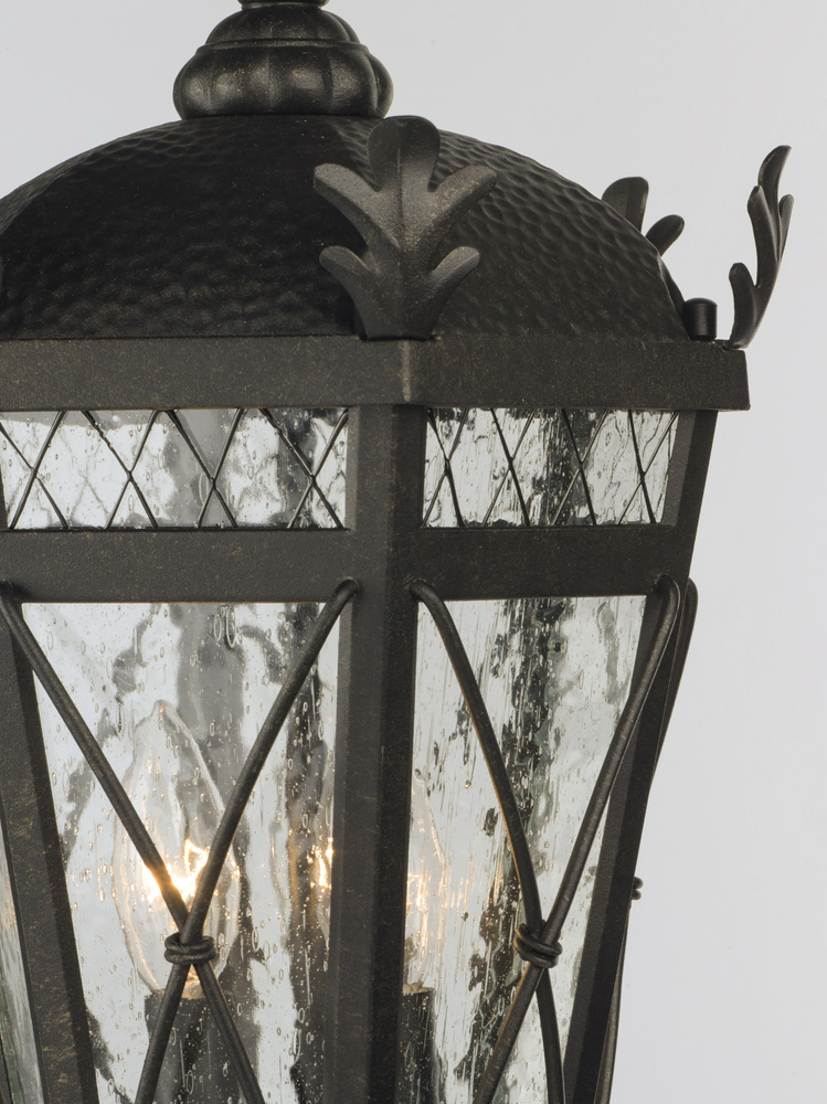 This popular collection is now available in die cast at a very affordable price. It has the same intricate details as the original including Artesian Bronze finish and clear Seedy glass. The hammered top, divided glass panel, and cross wire trim are deta