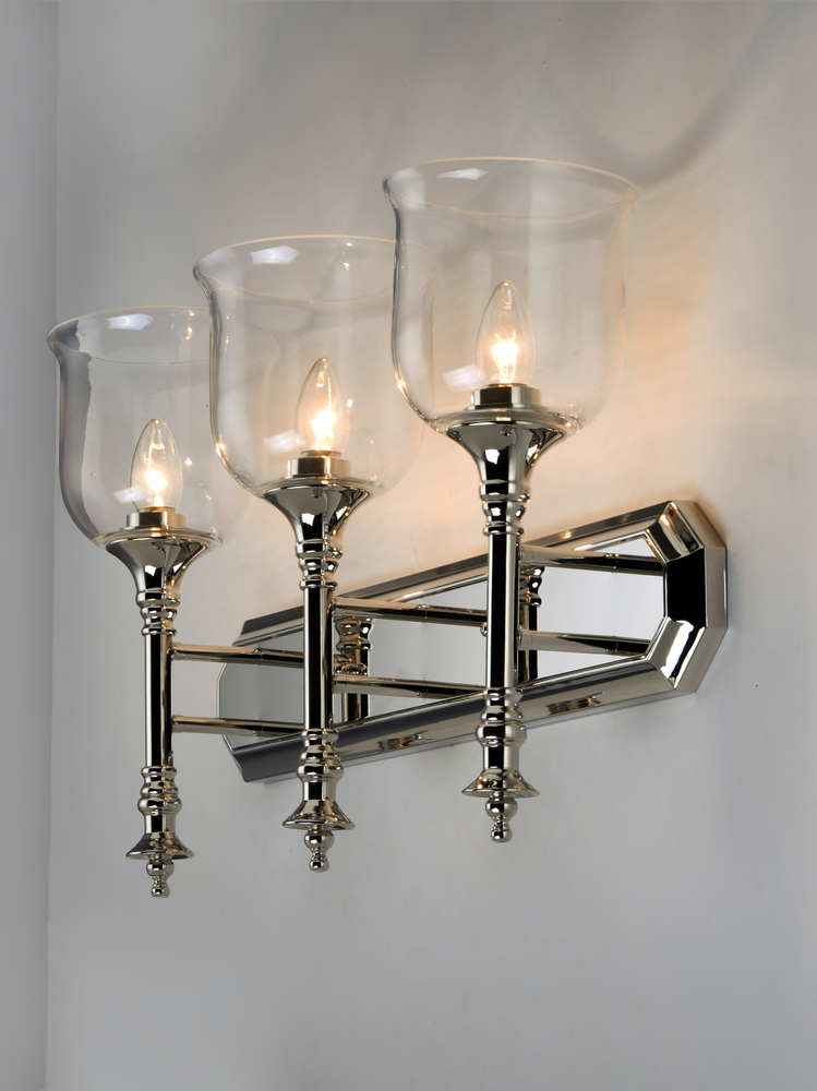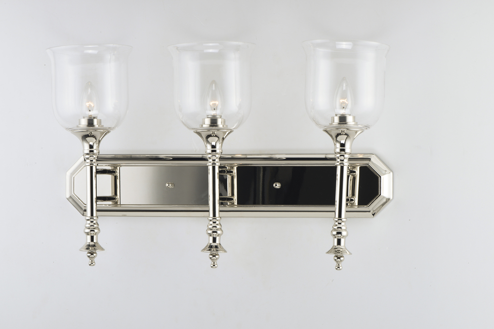 Traditional fonts of Polished Nickel support Clear glass shades reminiscent of Colonial times. This ageless design has upscale appeal at an attractive price.