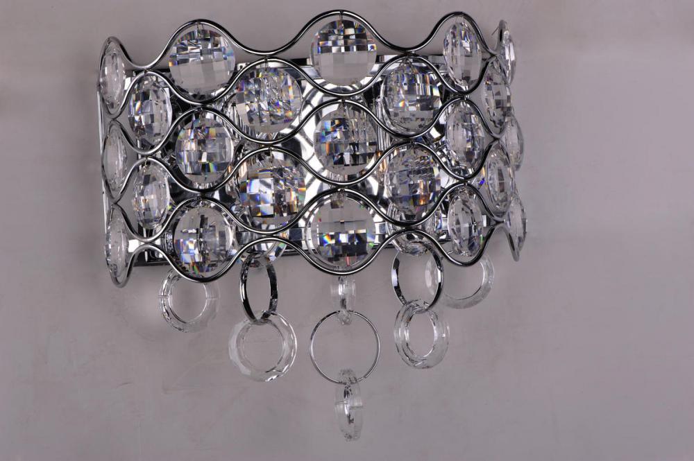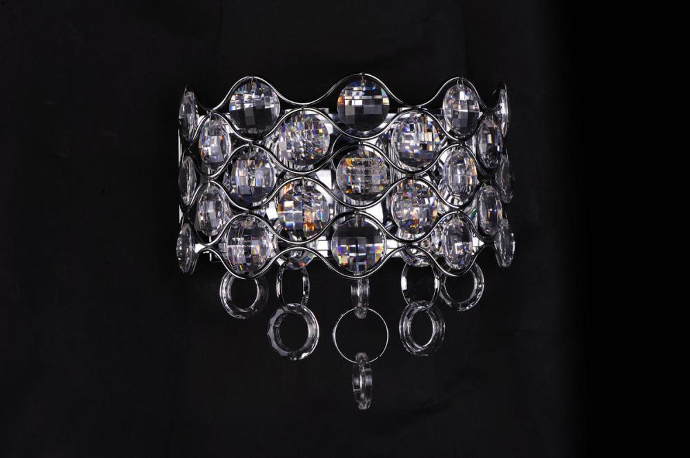 Chains of faceted crystal rings are linked together by Polished Chrome jewelry bands that cascade from the top and through the fixture. The exterior shade of wave-like metal encases multi-faceted Beveled Crystal jewels, which sparkle from the light of the