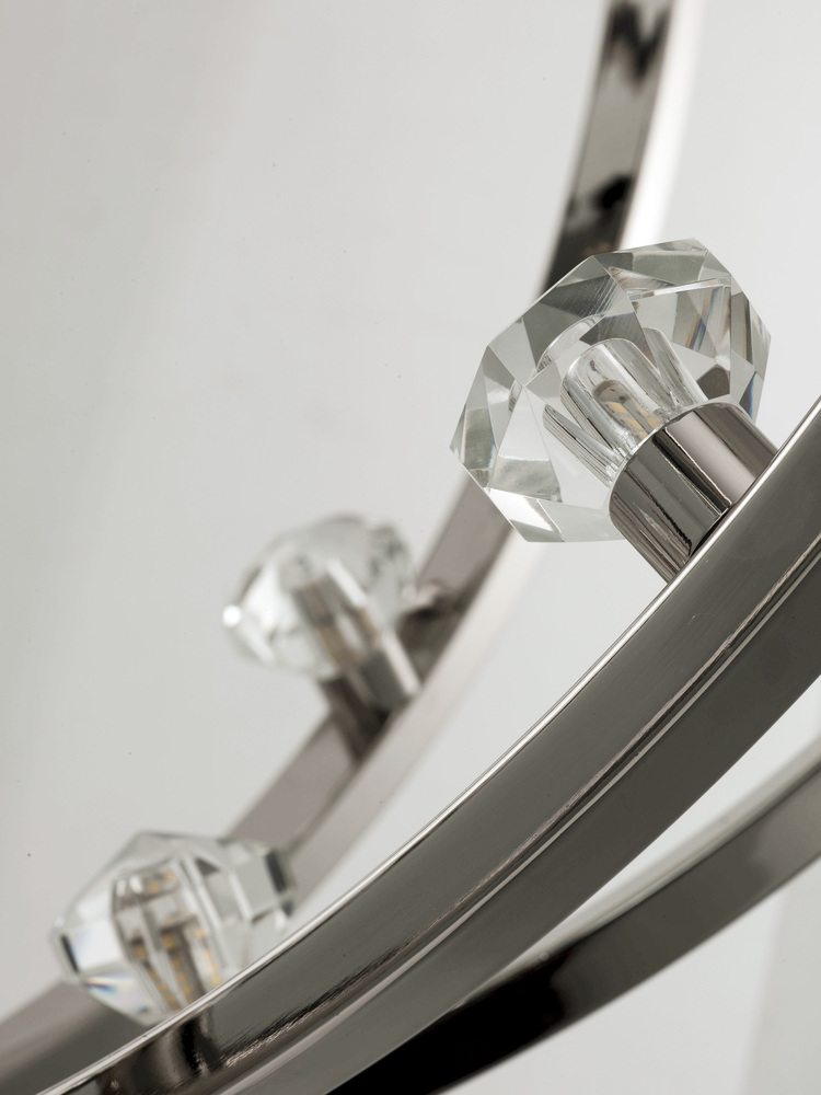 Bands of steel finished in Polished Nickle or Textured Black with Polished Nickle accents, create spherical forms of lighting. These spheres are graced with Beveled Crystal fonts which conceal dimmable LED bulbs. A perfect blend of grace, beauty and ener