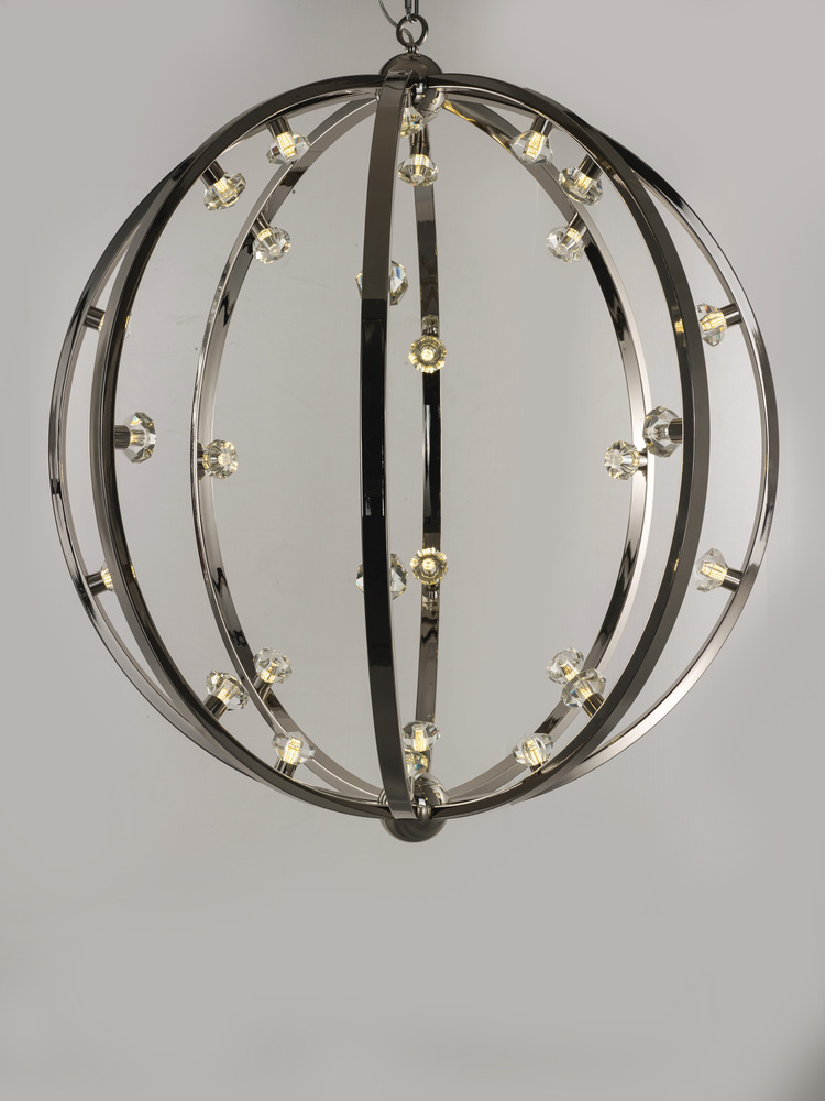 Bands of steel finished in Polished Nickle or Textured Black with Polished Nickle accents, create spherical forms of lighting. These spheres are graced with Beveled Crystal fonts which conceal dimmable LED bulbs. A perfect blend of grace, beauty and ener