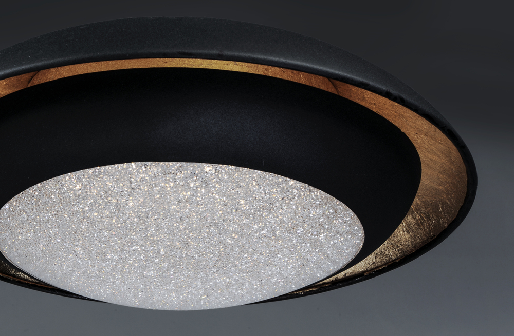 Domes of metal house a circular light engine housing with a Crystaline diffuser. A dramatic lighting effect is created with in-direct light highlighting the foil lining while direct light shines through the sparkling center. Available in your choice of Whi