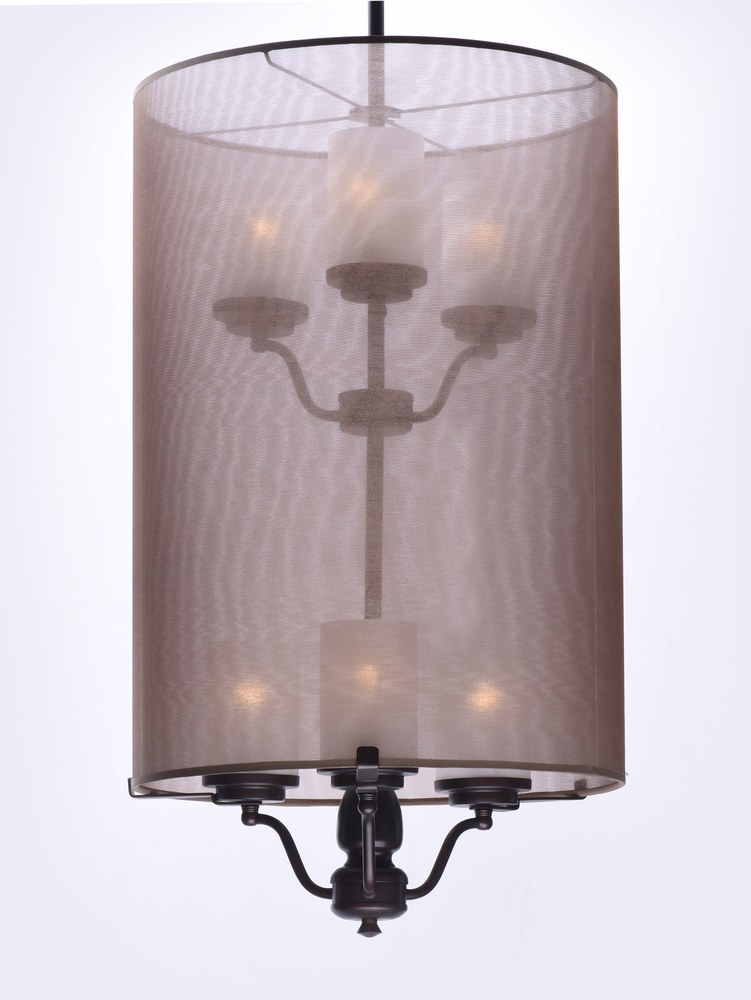 Drum shades constructed from two layers of sheer Organza fabric laminated to clear inner liner, allows light to shine out as well as down. White glass cylinder shades diffuse light and conceal the light source. Available in your choice of 2 finish combinat