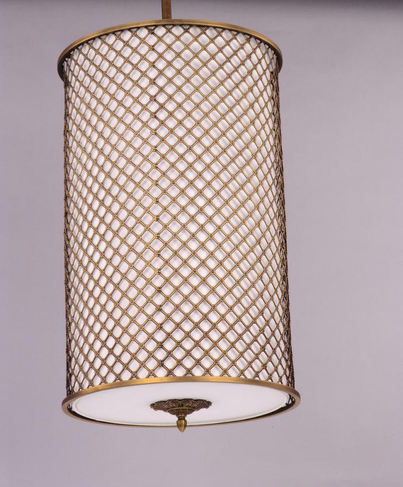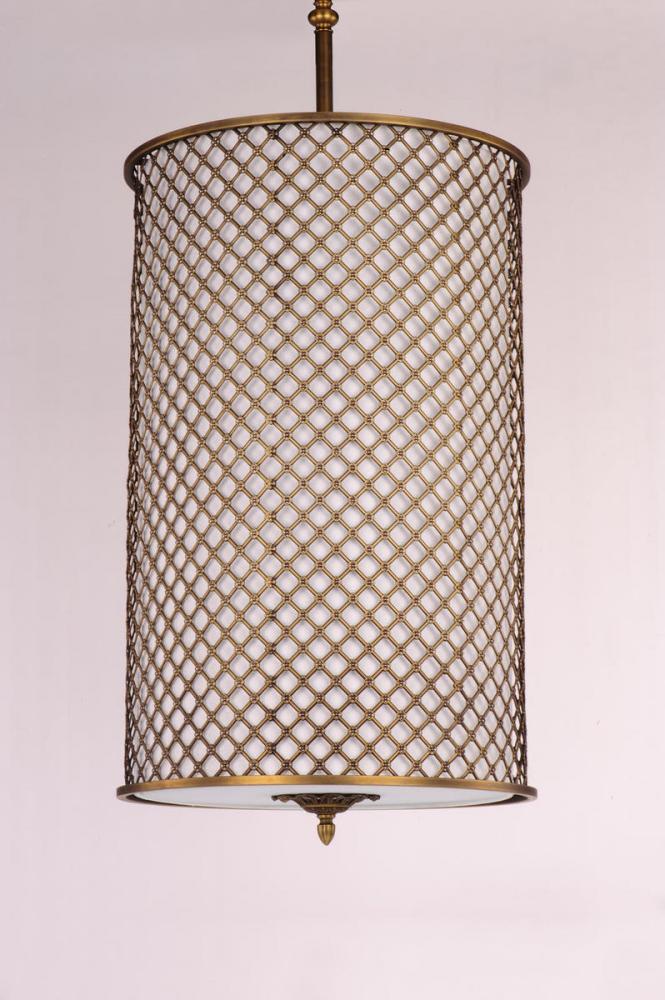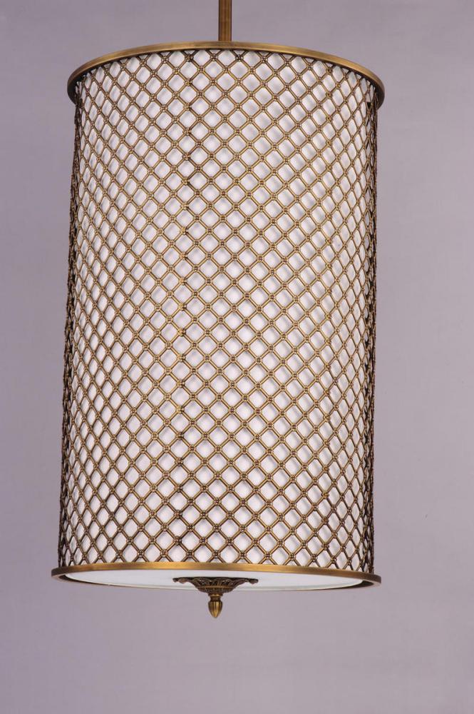 A traditional collection with the look of today features metal grids finished in a Natural Aged Brass that nicely contrasts the softness of the inner Oatmeal fabric shade. Each fixture has a glass diffuser, which is supported by ornate cast finials.