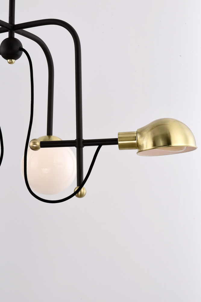 An eclectic design form combining function with Mid-Century influences features articulated arms that support parabolic shades that can swivel to direct the light. Available in your choice of Bronze with Satin Brass or Black with Satin Nickel, both with op