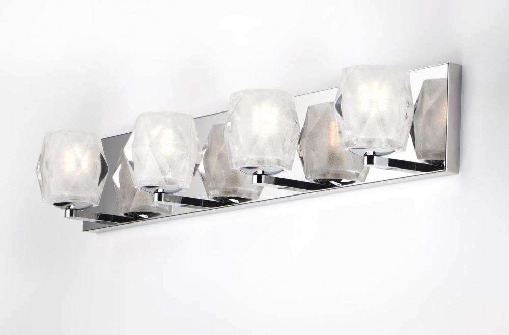 Faceted heavy glass of Clear Ice has a 3 dimensional illusion as well as a shimmering appearance when illuminated by high powered LED lamps included. Polished Chrome frames complete this sharp contemporary look in bath vanity lighting.