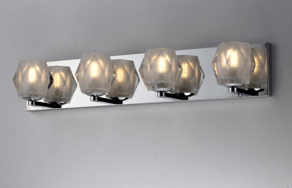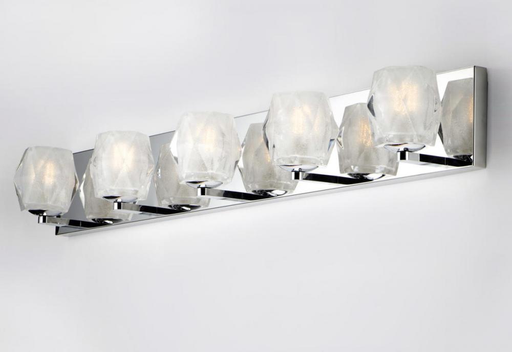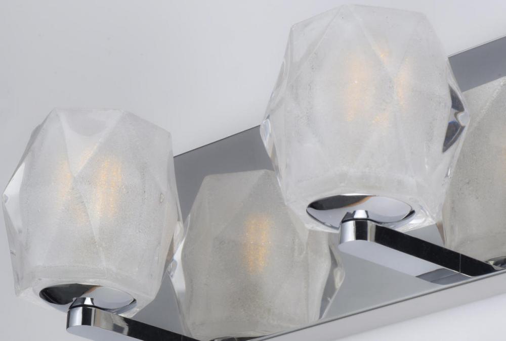 Faceted heavy glass of Clear Ice has a 3 dimensional illusion as well as a shimmering appearance when illuminated by high powered LED lamps included. Polished Chrome frames complete this sharp contemporary look in bath vanity lighting.