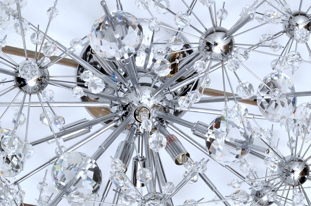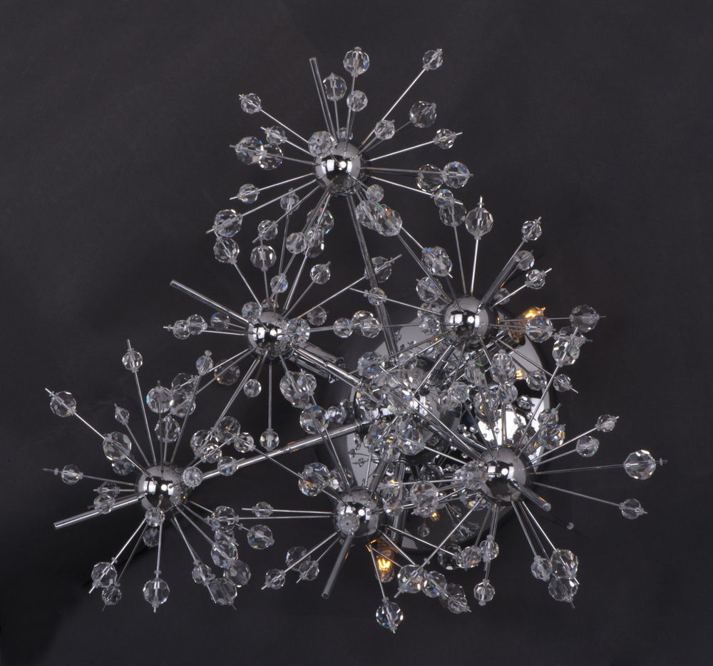 Spectacular display of Beveled Crystal beads of various sizes which are mounted on sculptures Polished Chrome metal formations which will sure to be the focal point of your room. The high power Xenon bulbs add sparkle to the crystal while producing a natu