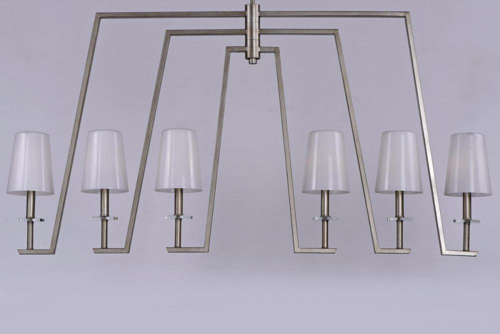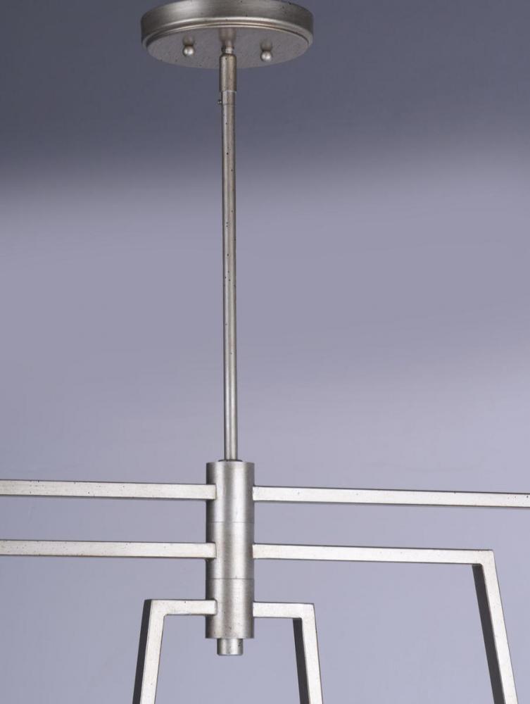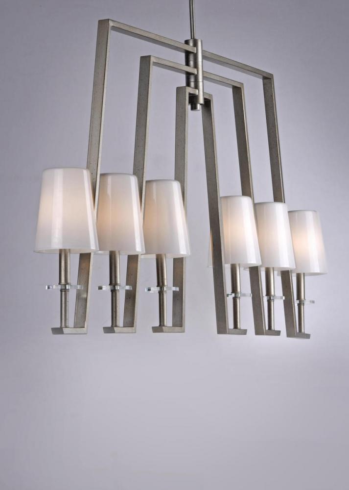 White opal glass shades suspend from angular metal frames available in our rich platinum dusk finish. The chandeliers' metal frames pivot which allows you to adjust the fixture creating a unique look and re-position the light to where it is needed.