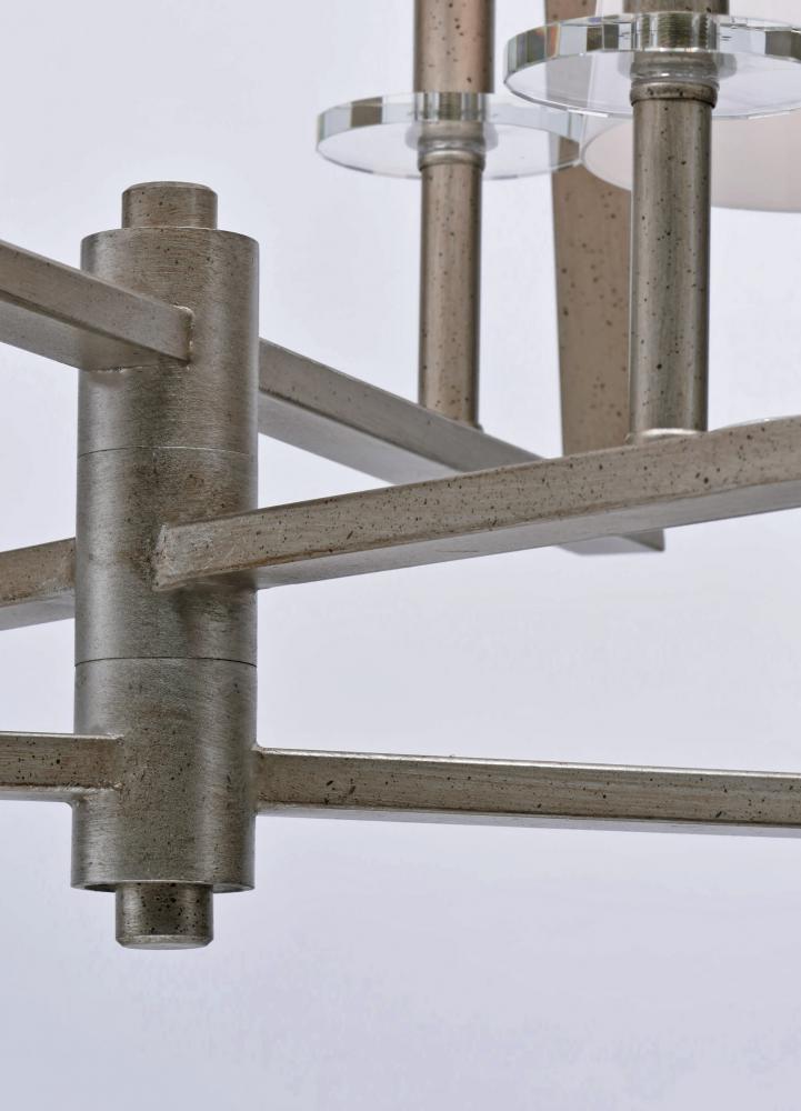 White opal glass shades suspend from angular metal frames available in our rich platinum dusk finish. The chandeliers' metal frames pivot which allows you to adjust the fixture creating a unique look and re-position the light to where it is needed.