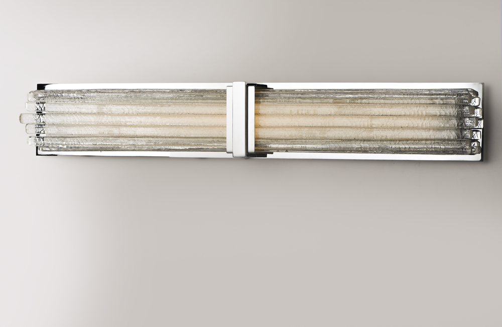 Hand formed Clear glass rods are mounted using various lengths to create this custom look. Installed on a frame of Polished Nickel this unique LED bath vanity has a very upscale appearance.