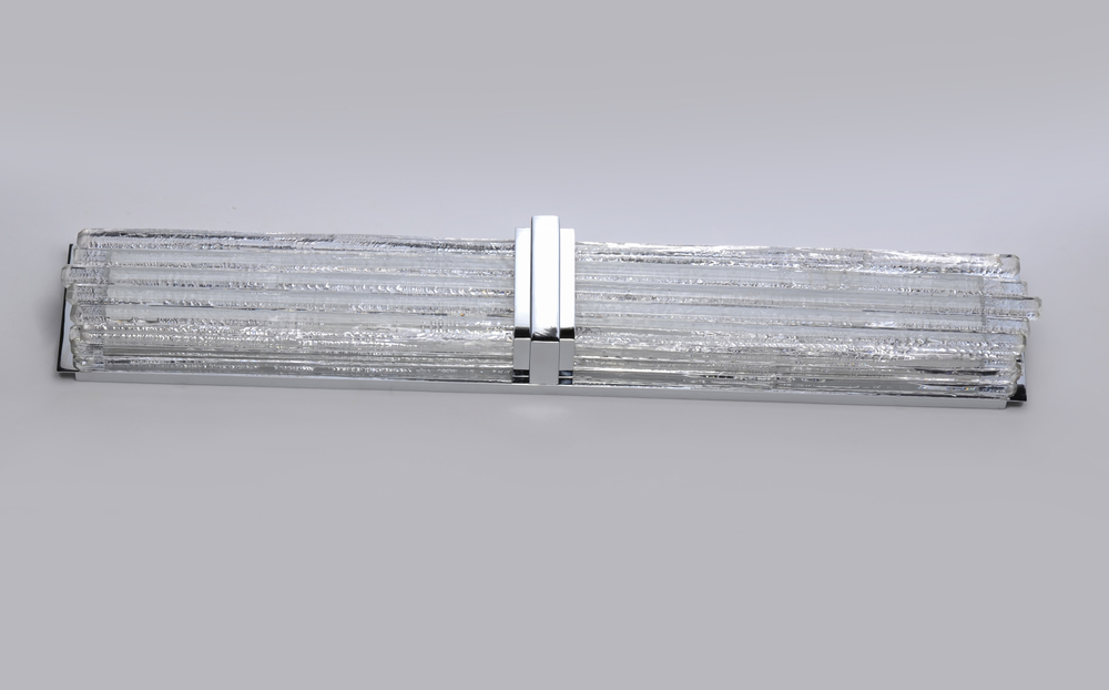 Hand formed Clear glass rods are mounted using various lengths to create this custom look. Installed on a frame of Polished Nickel this unique LED bath vanity has a very upscale appearance.
