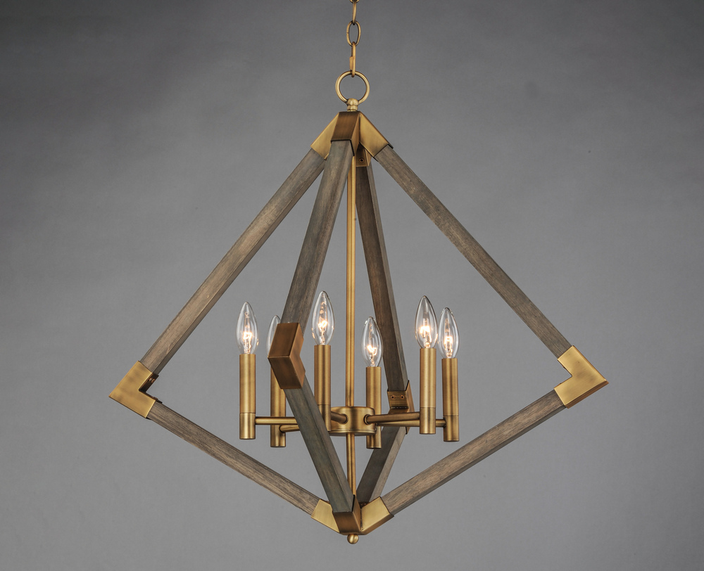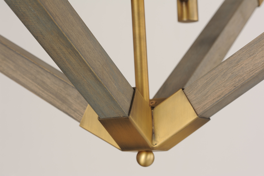 Prism shape pendants made of solid wood finished in Weathered Oak and trimmed with Antique Brass accents work beautifully over kitchen islands or dining tables. The contemporary shape and traditional finish demonstrate a transitional design that fits into
